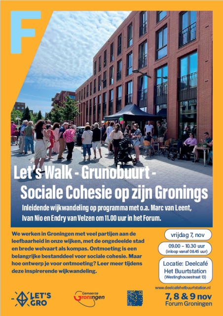 Hoe ontwerp je plekken waar mensen elkaar Ă©cht ontmoeten? Op 7 november ging Wijkmakers tijdens het inspiratiefestival Letâs Gro op pad in de Grunobuurt met corporaties, ontwerpers en bewoners voor een goed gesprek over ontmoeting in de publieke ruimte. Een inleiding en een wandeling lieten zien hoe ontmoetingen in en om wooncomplexen ontworpen kunnen worden en hoe ruimte daarmee kan bijdragen aan verbinding tussenbuurtbewoners. Aansluitend werd in het Forum met Wijkvernieuwing op zân Groningens, Marc van Leent en Groningse experts verdiept wat er nodig is om ontmoetingsplekken levendig te maken en te houden.De Grunobuurt - ontwerpen voor ontmoeting